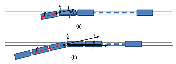 There is a reaction force ( ) to the force ( ) exerted by the remaining train on the derailed car. It produces two force components, and , as shown in Figure A-1a. While works directly as an impeding force against the travelling of the remaining train, works to push the wheels of the train against the side of the track to introduce a friction force against the travelling of the remaining train. Thus the impeding force against the train ( ) is actually a complex force, which is defined as: