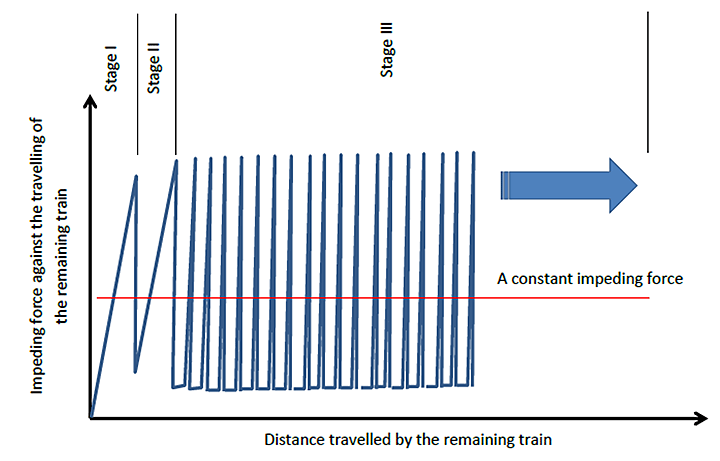 To estimate the speed reduction of the remaining train using the kinetic energy equilibrium method, it is necessary to understand the impeding force against the travelling of the remaining train in order to derive a representative force for the calculation or modelling.