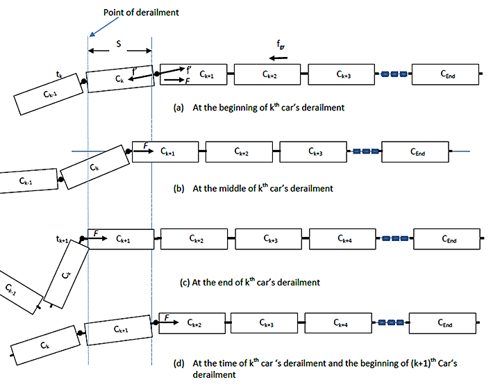 - The final stage starts when a car derails, rotates to an angle with respect to the track and is pushed forward by the remaining train to impact with the derailed cars in front, breaking the coupling between the couplers and causing the next tank car to derail. This process is repeated until the remaining train is stopped by the impeding force.