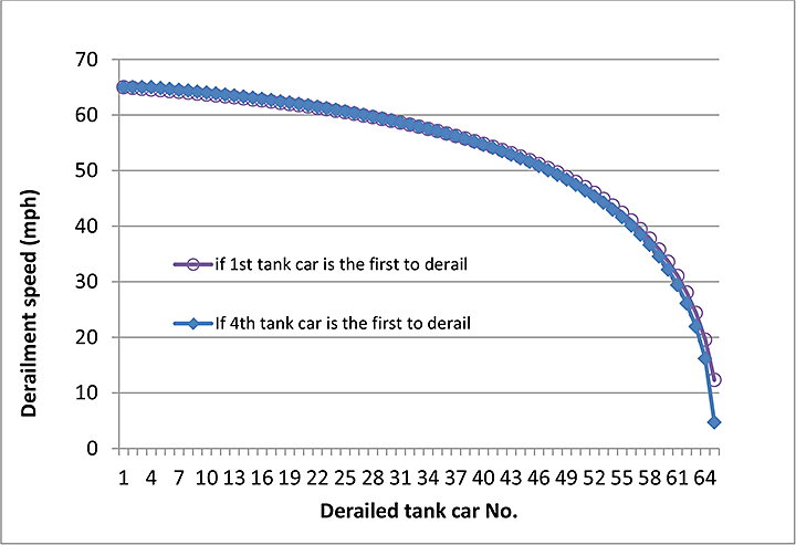 The above analysis is considered to be a first order approximation of the derailment speed of individual tank cars based on an idealized and constant impeding force against the movement of the remaining train still on the track.