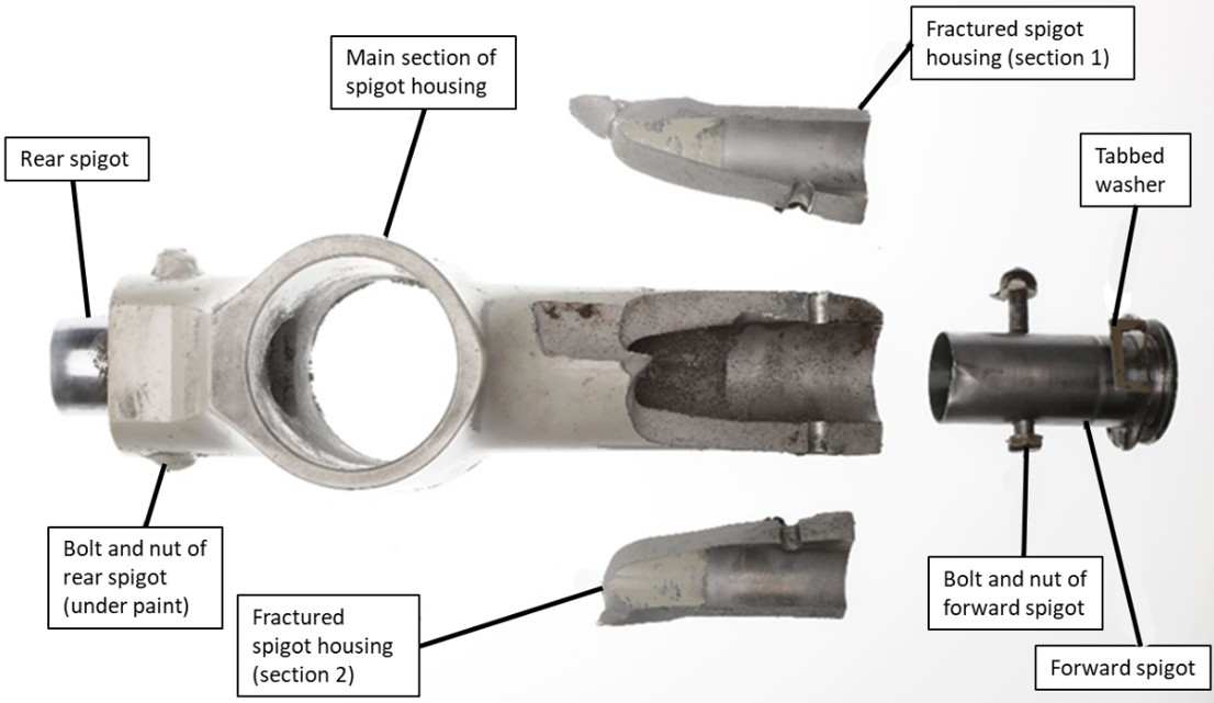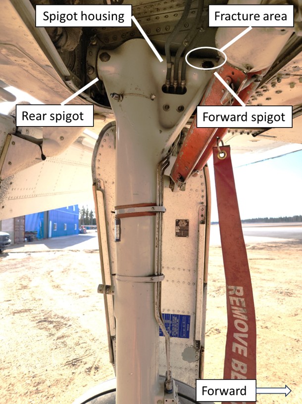Each MLG unit is attached to the wing by half cap bearing housings mounted to the spigots through the spigot housing. During the landing of the occurrence flight, the spigot housing of the left MLG unit failed, resulting in the collapse of this MLG unit (figures 2, 3, and 4).