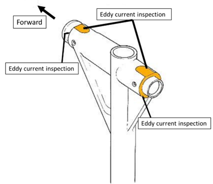 SB 32-19 lists the minimum requirements for the equipment and provides instructions for both the set-up of the instrumentation and calibration and the carrying out of the eddy current inspection. The areas to be inspected are to be cleaned, and if any of the protective finish shows signs of lifting or cracking, the areas are to be cleaned back to the bare metal. The forward and rear faces of the spigot housing as well as the forward and rear machined flat surfaces are to be inspected (Figure 9).