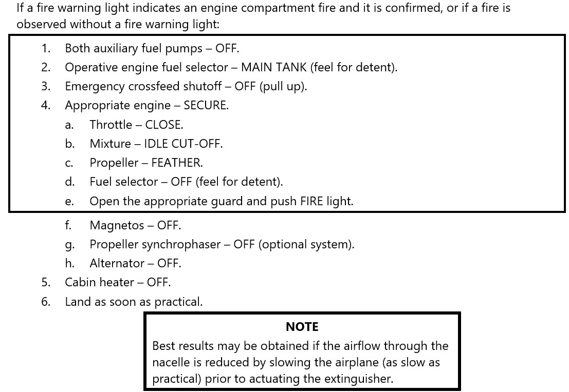 The engine fire emergency procedure (Figure 4) contains memory items (boxed) and non-memory items (not boxed).In the Cessna 421C pilot operating handbook, emergency procedure steps that are enclosed within a solid black line (“boxed” items) are immediate-action items and should be committed to memory