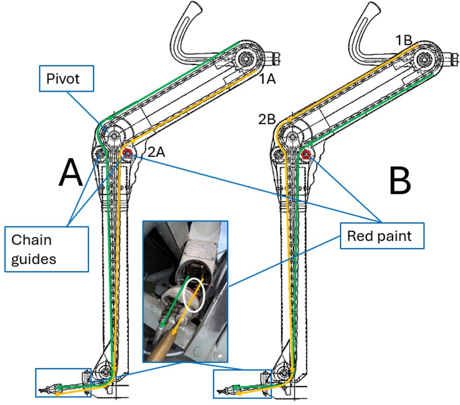 However, when the chain was threaded, the aircraft maintenance manual was not consulted. The apprentice was therefore unaware of the warning about the use of the red paint to thread the chain, and he unknowingly threaded the chain in the opposite direction (Figure 1, point 1B to point 2B).