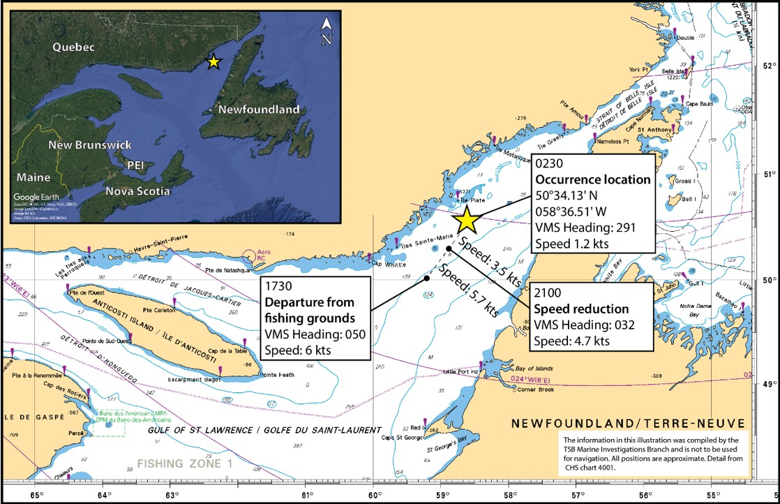 Based on Vessel Monitoring SystemFisheries and Oceans Canada, “National Vessel Monitoring System,” at https://www.dfo-mpo.gc.ca/fisheries-peches/sdc-cps/vessel-monitoring-surveillance-navire/index-eng.html (last accessed on 16 October 2025). (VMS) data, at 1730 the vessel was making its way towards its home port at a heading of 050° true (T) and a speed over ground of 6 knots. The winds in the area of sailing were light.