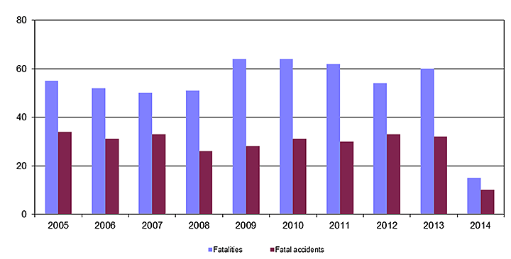 The number of fatalities (15), was substantially lower than the 2013 total of 60, and the 5-year average of 61. The number of serious injuries (29) was higher than the 2013 total of 19 but slightly lower than the 5-year average of 33.