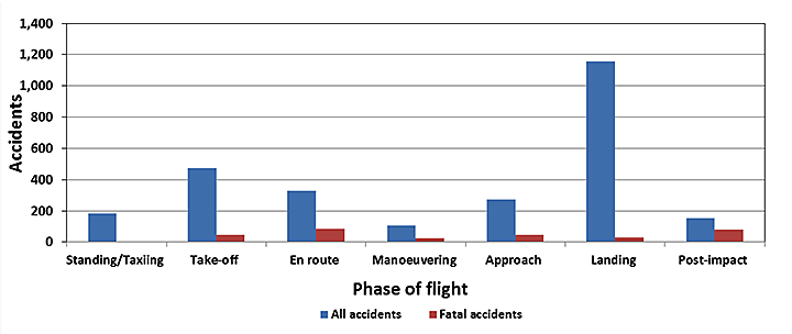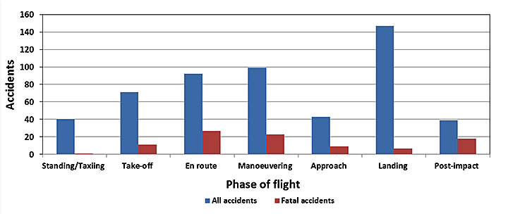 Although a single accident may involve more than one event within a phase, that accident is only counted once in the phase total. Therefore, the total of events within a phase will not sum to phase event totals. For example, in the take-off phase, if an occurrence involves both loss of control and power loss events, the occurrence is counted in each event category, but only once in the phase total. As well, approximately 5% of aeroplane accidents and 25% of helicopter accidents involve events in more than one phase of flight (not including post-impact), so the accidents shown in Figure 5 and Figure 6 sum to more than the total of accidents.