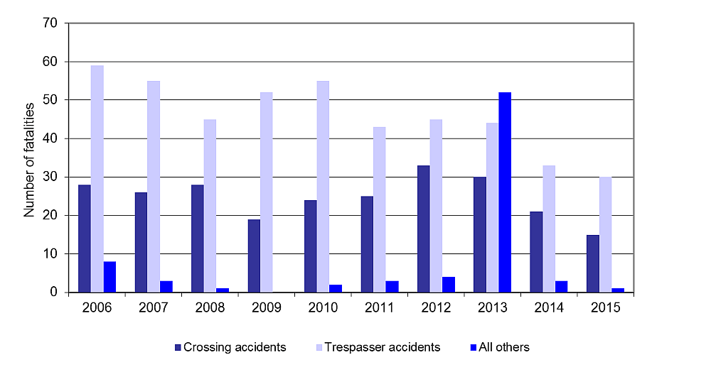 Crossing-related fatalities totalled 15 in 2015 compared with 21 in 2014 and the average of 27 in the previous 5-year period. Pedestrians were 27% of crossing-related fatalities.
