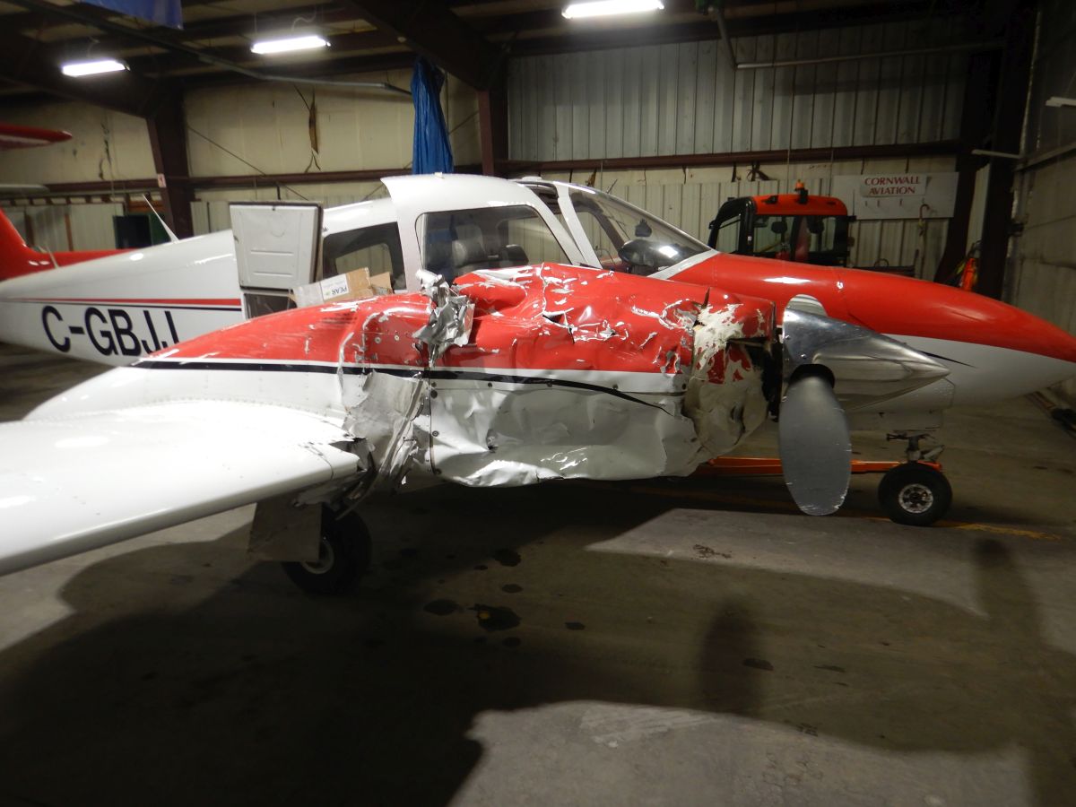 Le Piper PA-44-180, avec deux occupants à bord, a subi des dommages importants, mais il est demeuré manœuvrable et a atterri en toute sécurité à l’aéroport régional de Cornwall. Le BST mène une enquête.