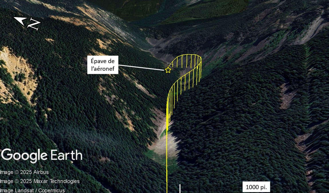 Transports Canada (TC) a publié un dépliantTransports Canada, TP 2228-32F, Règles de vol à vue (VFR) pour les vols dans les montagnes (révisé le 28 juin 2018). qui fournit des consignes sur le vol en montagne, notamment sur l’importance de ne pas voler au milieu d’une vallée et de maintenir une position sur un seul côté afin de conserver un parcours d’évacuation offrant un rayon de virage sécuritaire. De même, la Civil Aviation Authority de la Nouvelle-Zélande a publié une brochure intitulée Mountain FlyingCivil Aviation Authority de la Nouvelle-Zélande, Mountain Flying (révisé en mai 2021), à l’adresse www.aviation.govt.nz/assets/publications/gaps/caa-gap-mountain-flying-may-2021-web.pdf (dernière consultation le 3 mars 2026)., qui souligne que les pilotes ne doivent jamais positionner l’aéronef au milieu de la vallée en raison du risque accru de ne pas disposer de suffisamment d’espace et de temps pour effectuer un demi-tour. Le vol à l’étude n’a pas suivi cette pratique. Lorsque l’aéronef est passé du milieu de la vallée au côté sud, environ 11 secondes avant d’amorcer le virage de demi-tour, il n’a pas utilisé tout l’espace latéral disponible.