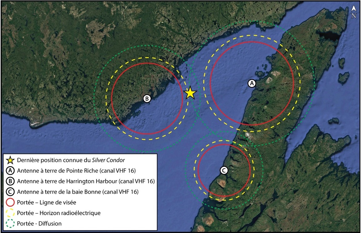 Le Silver Condor était équipé de 2 radiotéléphones à très haute fréquence (VHF) dont les microphones se trouvaient près l’un de l’autre. L’un des radiotéléphones était muni d’un système d’appel sélectif numérique (ASN) et réglé au canal 16 (le canal d’urgence), tandis que l’autre fonctionnait sur le canal 10 (le canal de travail des pêcheurs dans la région). Lorsqu’une alerte de détresse ASN est activée, le radiotéléphone VHF-ASN émettant a une fonction de répétition automatique afin que le message de détresse soit transmis jusqu’à ce qu’il soit annulé ou jusqu’à ce qu’on ait accusé réception du message. Toutes ces fonctionnalités permettent de maximiser le potentiel d’intervention.