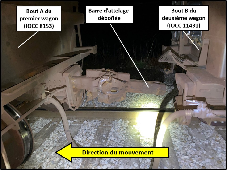 Le 1er wagon du train (IOCC 8153) a déraillé au bout A et est resté attelé aux locomotives de tête. La barre d’attelage du 2e wagon (IOCC 11431) s’était déboîtée de la longrine de traction, mais était demeurée attelée au 1er wagon (figure 2).