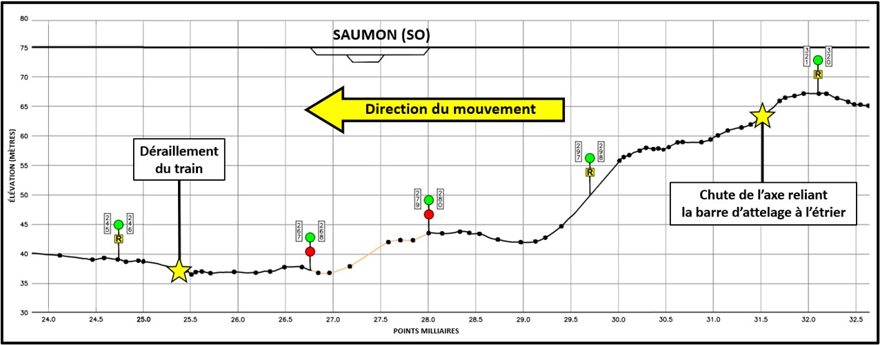 Les données recueillies ont notamment permis d’établir qu’avant le déclenchement du serrage d’urgence des freins sur chaque wagon, le ML venait de réduire graduellement l’intensité du freinage rhéostatique, conformément aux pratiques d’exploitation en vigueur au QNS&L. Le train arrivait alors au pied d’une pente descendante et s’apprêtait à gravir une section de voie en pente ascendante.