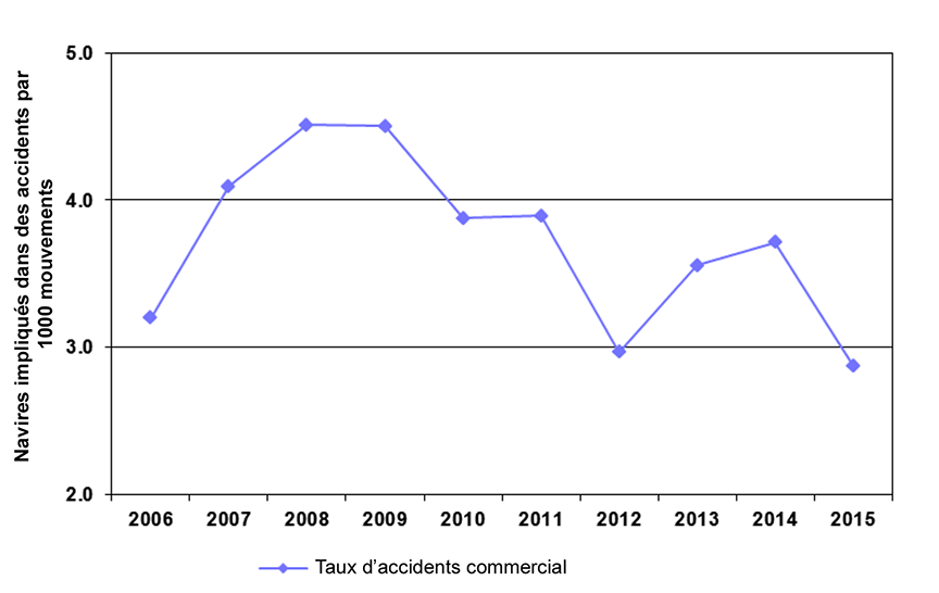 En 2015, les accidents de navigation dans les eaux canadiennes ont concerné 32 navires étrangers; 30 de ces navires étaient des navires de commerce autres que des bateaux de pêche. D'après les renseignements fournis par Transports Canada, l'activité maritime des navires de commerce étrangers autres que des bateaux de pêche a totalisé 26 300 mouvements commerciaux en 2015, ce qui est comparable à la moyenne de 26 220 mouvements commerciaux pour la période de 2010 à 2014. Le taux d'accidents est donc de 1,1 accident par 1000 mouvements de navires de commerce, en baisse par rapport à la moyenne quinquennale de 1,6.