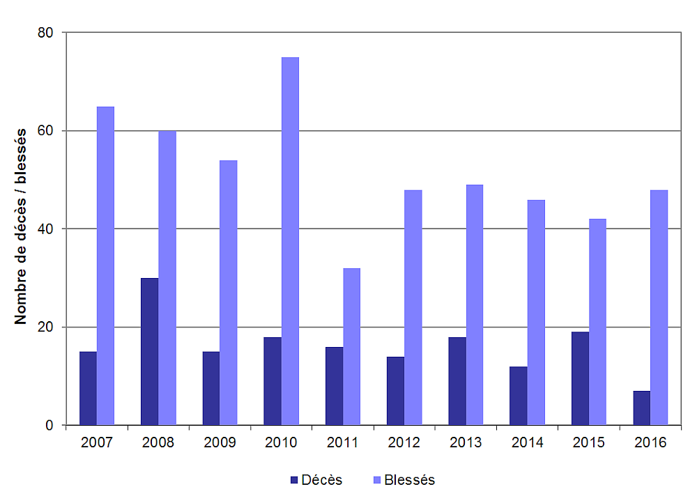 En 2016, le nombre de blessés graves (48) a augmenté par rapport à 2015 (42) et à la moyenne annuelle de 2011 à 2015 (43). En tout, 43 des 48 blessés graves ont été victimes d'accidents à bord de navires.