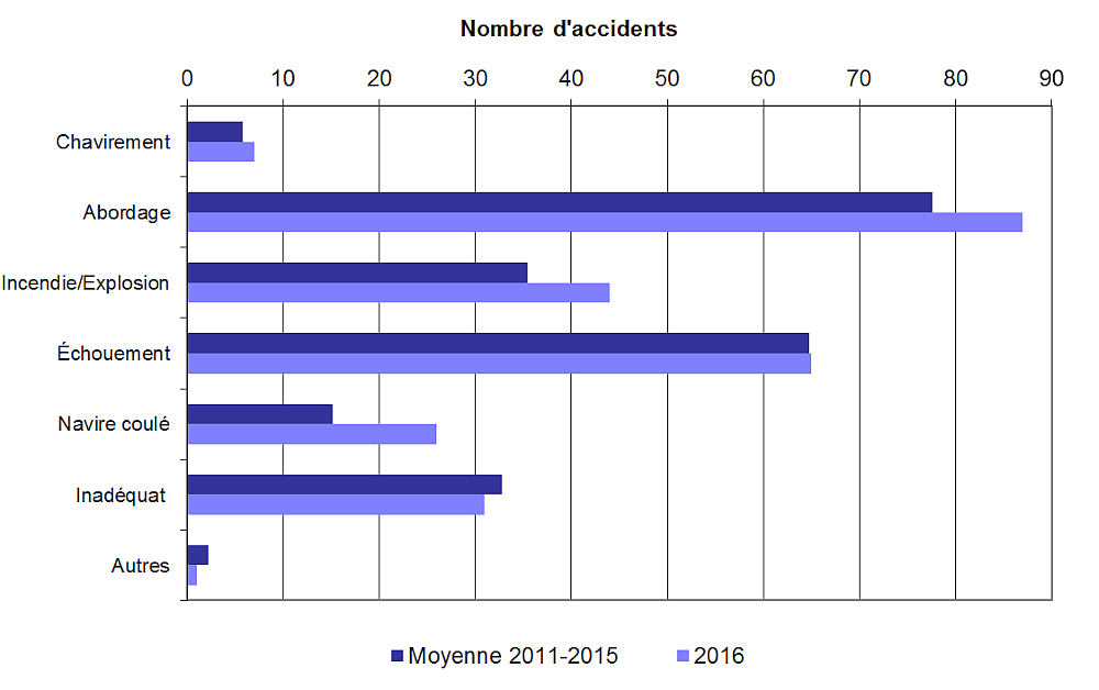 Comme le montre la figure 3, les heurts (33 %), les échouements (25 %), les incendies et explosions (17 %) et les avaries compromettant la navigabilité ou rendant le navire inutilisable aux fins prévues (12 %) représentent les types d'accidents de navigation les plus fréquents en 2016. Le nombre de heurts a augmenté de 12 % par rapport à la moyenne quinquennale (de 78 à 87) alors que le nombre d'échouements est demeuré le même par rapport à la moyenne quinquennale (65). Toujours par rapport à la moyenne quinquennale, le nombre d'avaries compromettant la navigabilité ou rendant le navire inutilisable aux fins prévues a connu une baisse de 5 % (de 33 à 31). Le nombre d'incendies et d'explosions a augmenté de 24 % par rapport à la moyenne quinquennale, passant de 35 à 44.