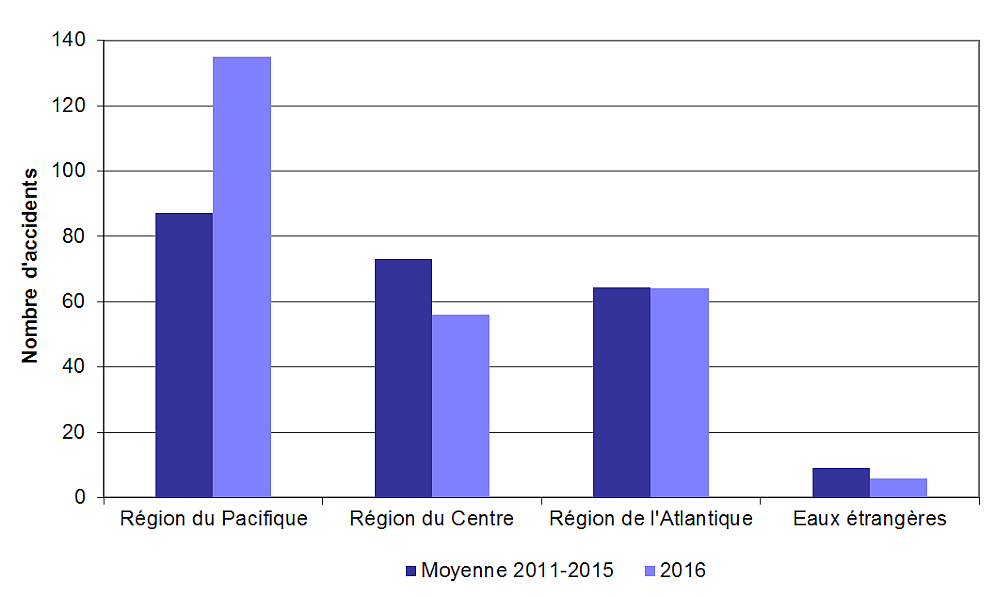 En 2016, 52 % des accidents de navigation sont survenus dans la région du Pacifique, 25 % dans la région de l'Atlantique et 21 % dans la région du Centre. La tranche restante de 2 % vise des accidents de navigation survenus dans les eaux étrangères. Dans la région du Pacifique, le nombre d'accidents de navigation a augmenté de 55 % par rapport à la moyenne de 2011 à 2015 (de 87 à 135). Dans la région de l'Atlantique, ce type d'accident est demeuré inchangé par rapport à la moyenne de 2001 à 2015 (64). Dans la région du Centre, le nombre d'accidents de navigation a reculé de 23 % (de 73 à 56) comparativement à la moyenne de 2011 à 2015 (figure 5).