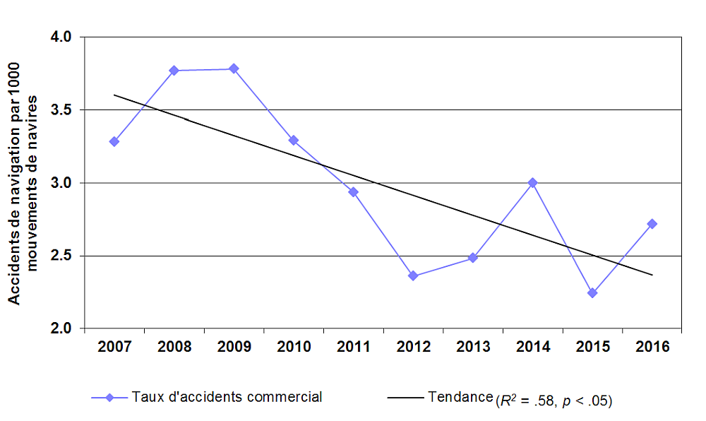 En 2016, les accidents de navigation dans les eaux canadiennes ont concerné 35 navires étrangers; 31 de ces navires étaient des navires de commerce autres que des bateaux de pêche. D'après les renseignements fournis par Transports Canada, l'activité maritime des navires de commerce étrangers autres que des bateaux de pêche a totalisé 26 380 mouvements commerciaux en 2016, ce qui est comparable à la moyenne de 26 274 mouvements commerciaux pour la période de 2011 à 2015, mais qui constitue une baisse de 3 % par rapport à la moyenne de 2006 à 2015 (27 074). Le taux d'accidents est donc de 1,0 accident par 1000 mouvements de navires de commerce, en baisse par rapport à la moyenne quinquennale de 1,3 et à la moyenne décennale de 1,5.