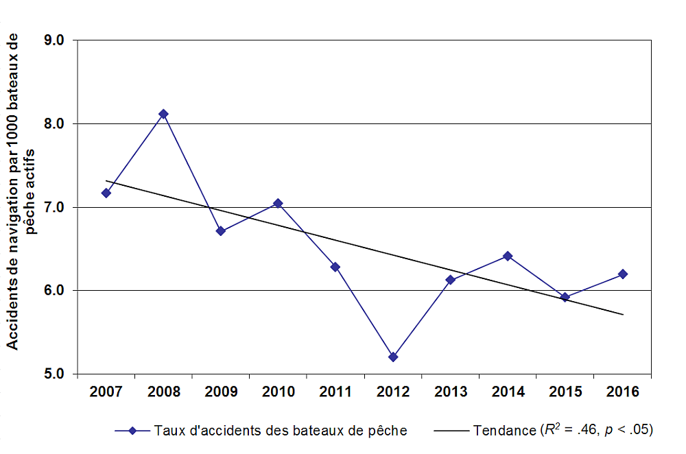 En 2016, il y avait environ 13 563 bateaux de pêche actifs au CanadaNote de bas de page 2. Le taux d'accidents de navigation pour les bateaux de pêche canadiens est passé de 5,9 bateaux de pêche par 1000 bateaux de pêche actifs en 2015, à 6,2 en 2016, une hausse par rapport à la moyenne quinquennale de 6,0. Par ailleurs, on a constaté une tendance à la baisse statistiquement significative du taux d'accidents de navigation mettant en cause des bateaux de pêche canadiens au cours des 10 dernières années (p<.05) (figure 7).