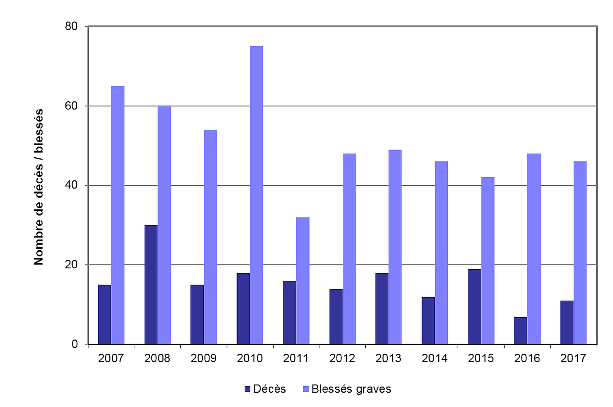 En 2017, le nombre de blessés graves (46) a baissé par rapport à 2016 (48) et à la moyenne annuelle de 2007 à 2016 (52). En tout, 39 des 46 blessés graves (85 %) ont été victimes d'accidents à bord de navires.