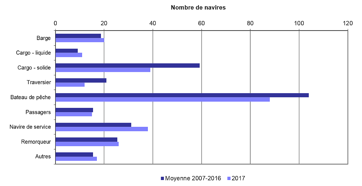 En 2017, 86 % des 266 navires en cause dans des accidents de navigation signalés au BST étaient des navires canadiens. Au total, 40 % d'entre eux étaient des navires de commerce autres que des bateaux de pêche, 37 % étaient des bateaux de pêche et la dernière tranche de 23 % comprenait des navires non commerciaux, des embarcations de plaisance ou des navires de service.