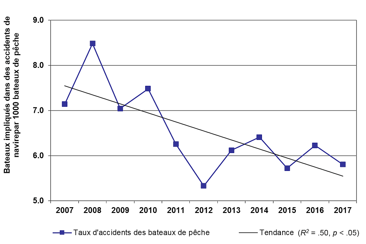 En 2017, il y avait environ 12 742 bateaux de pêche actifs au CanadaNote de bas de page 4. Le taux d'accidents de navigation pour les bateaux de pêche canadiens est passé de 6,2 bateaux de pêche par 1000 bateaux de pêche actifs en 2016, à 5,8 en 2017, ce qui représente une baisse de 13 % par rapport à la moyenne décennale précédente. Par ailleurs, on a constaté une tendance à la baisse statistiquement significative du taux d'accidents de navigation mettant en cause des bateaux de pêche canadiens au cours des 11 dernières années (p <0,05) (figure 7).