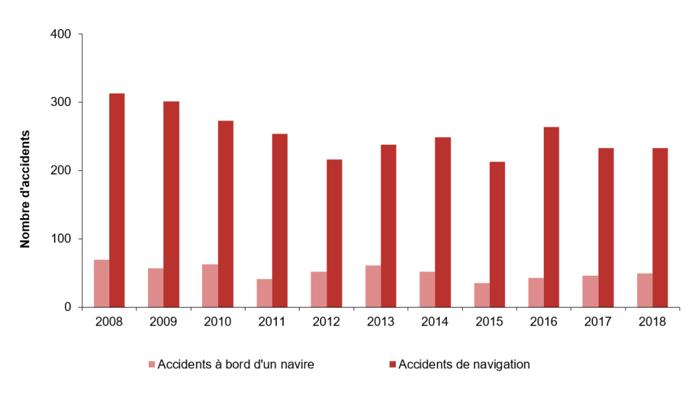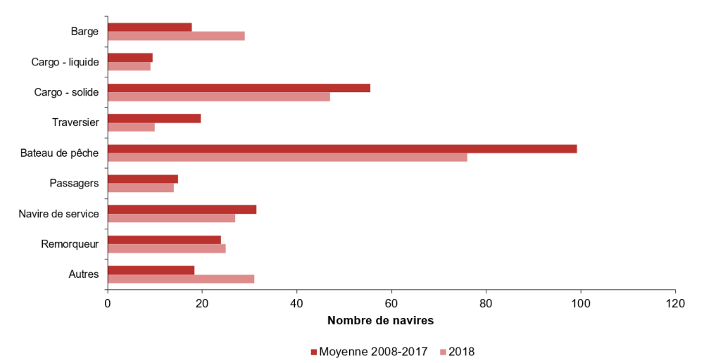On a enregistré 233 accidents de navigation en 2018, soit le même nombre qu'en 2017 et en baisse de 9 % par rapport à la moyenne de 2008 à 2017 (255). La plupart des accidents de navigation mettaient en cause des bateaux de pêche (28 %) et des navires qui transportent des cargaisons solides (18 %).