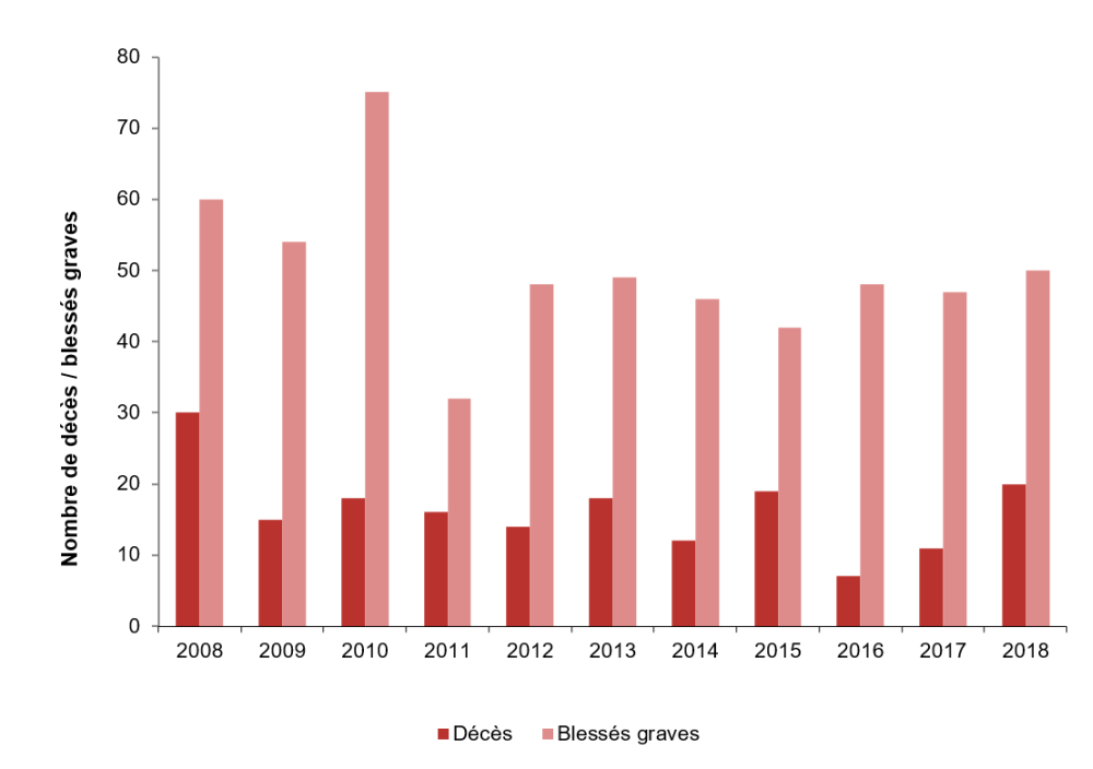 En 2018, le nombre de blessés graves (50) a augmenté par rapport à 2017 (47) et égale la moyenne décennale de 2018‑2017 (50). En tout, 45 des 50 blessés graves (90 %) ont été victimes d'accidents à bord de navires.