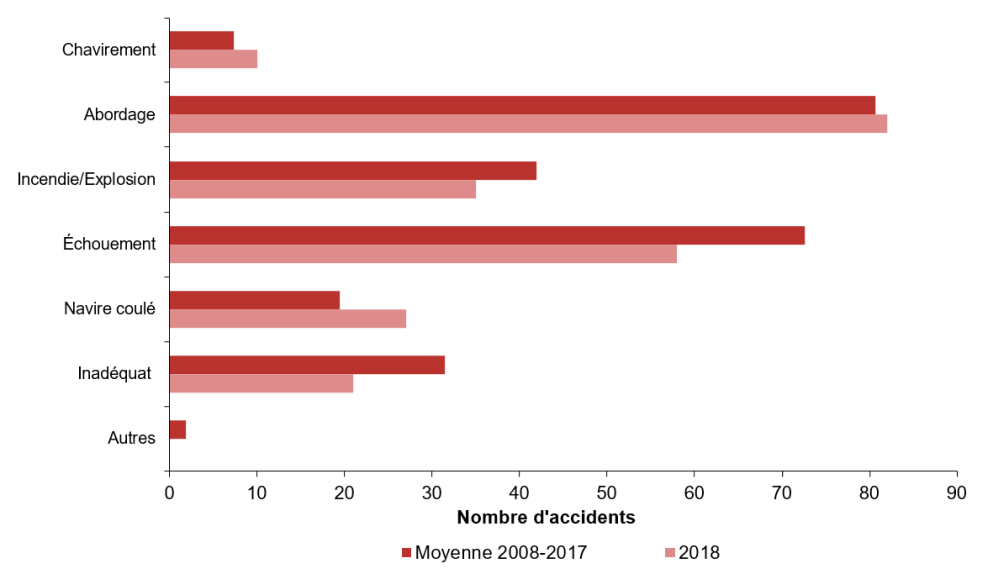 Comme le montre la figure 3, les abordages (35 %), les échouements (25 %), les incendies et explosions (15 %) et les naufrages (12 %) ont été les types d'accidents de navigation les plus fréquents en 2018. Le nombre total d'abordages (82) a connu une hausse de 2 % par rapport à la moyenne annuelle des 10 années précédentes (81), tandis que le nombre d'échouements (58) a connu une baisse de 20 % par rapport à la moyenne (73) pour la même période. Le nombre d'accidents de naufrage (27) a été supérieur de 38 % par rapport à la moyenne décennale de 20.