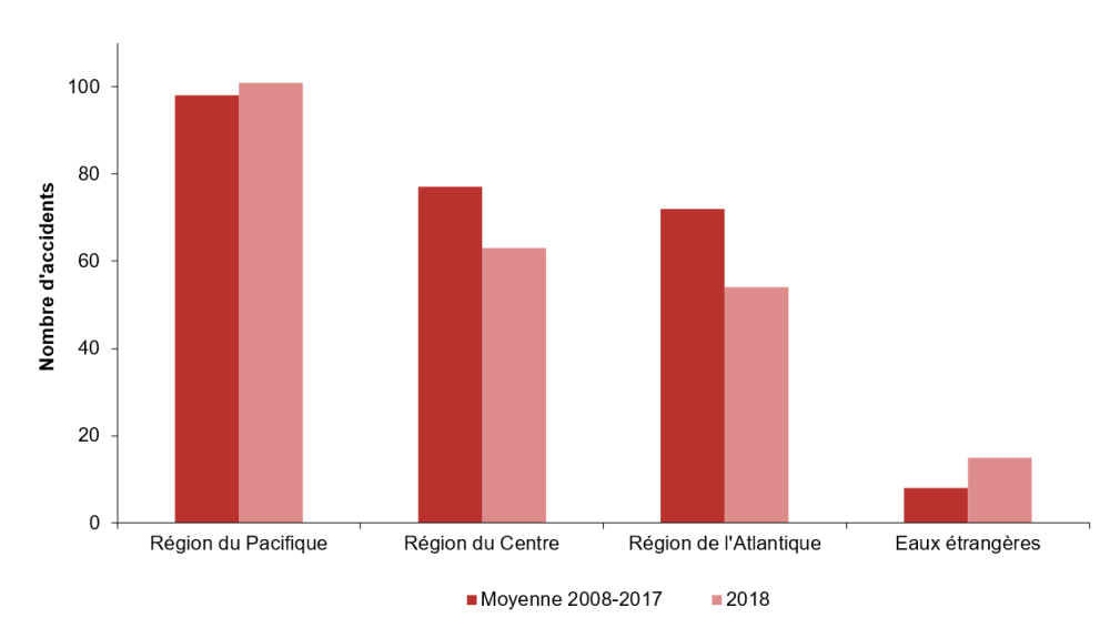 Dans la région de l'Atlantique, 36 bateaux de pêche ont été en cause dans des accidents de navigation, en baisse comparativement à la moyenne de 2008 à 2017 (52). Dans la région du Pacifique, 30 bateaux de pêche ont été en cause dans des accidents de navigation, en baisse comparativement à la moyenne de 2008 à 2017 (38) (tableau 2).