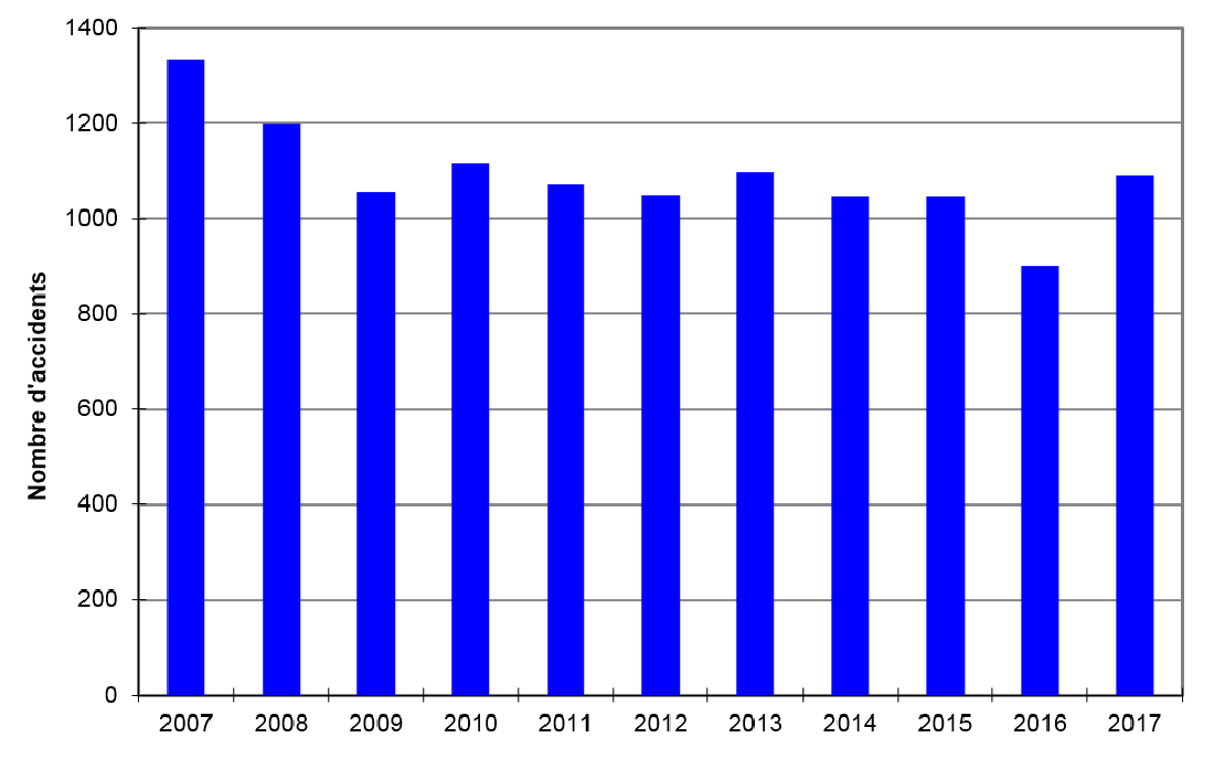 En 2017, 1091 accidents ferroviaires Note de bas de page 1 ont été signalés au BST (figure 1), ce qui représente une hausse de 21 % par rapport aux 900 accidents enregistrés en 2016, mais ce nombre est égal à la moyenne décennale (2007 à 2016) de 1092 accidents.