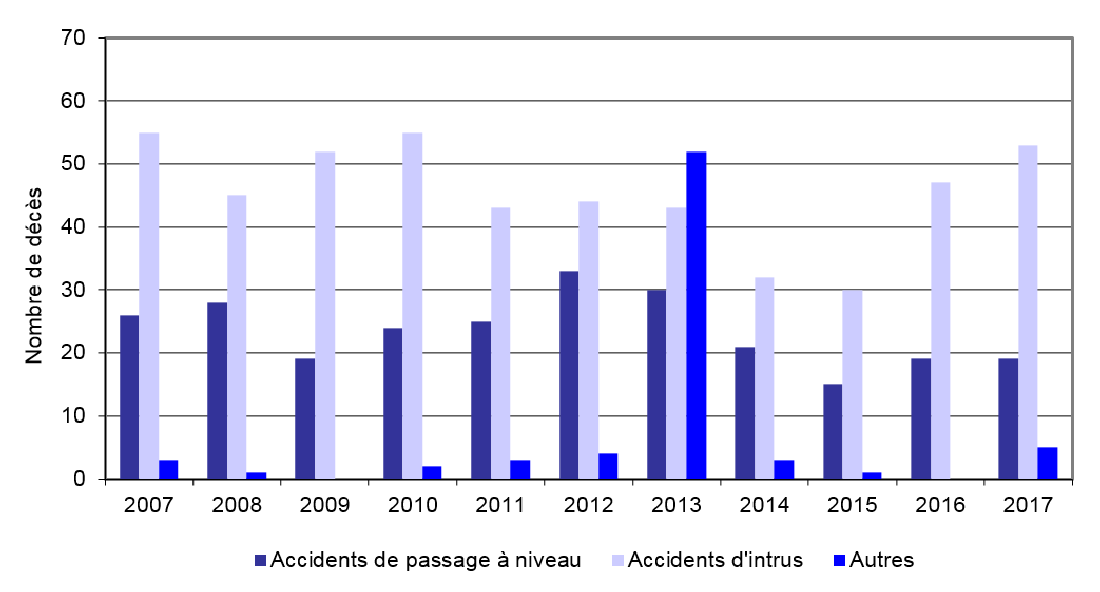| Année | Accidents de passage à niveau | Accidents d'intrus | Autres |