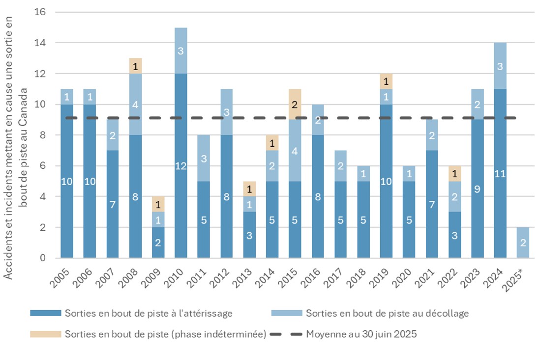 Du 1er janvier 2005 au 30 juin 2025, il y a eu en moyenne neuf sorties en bout de piste par année aux aérodromes canadiens (Figure 1), dont sept se sont produites à l’atterrissage. Alors que les chiffres varient d’une année à l’autre, il n’y a aucune tendance statistiquement significative. Le BST a enquêté sur 32 des 189 événements survenus au cours de cette période et a formulé six recommandations à l’intention des autorités canadiennes. Cinq recommandations sont toujours activesRecommandations A20-02, A20-01, A07-06, A07-05, et A07-01 du BST. et une est ferméeRecommandation A07-03 du BST.. Depuis le 1er avril 2022, 30 sorties en bout de piste ont été signalées au BST, dont huit ont donné lieu à des enquêtes comportant des faits établis ou des messages de sécurité.
