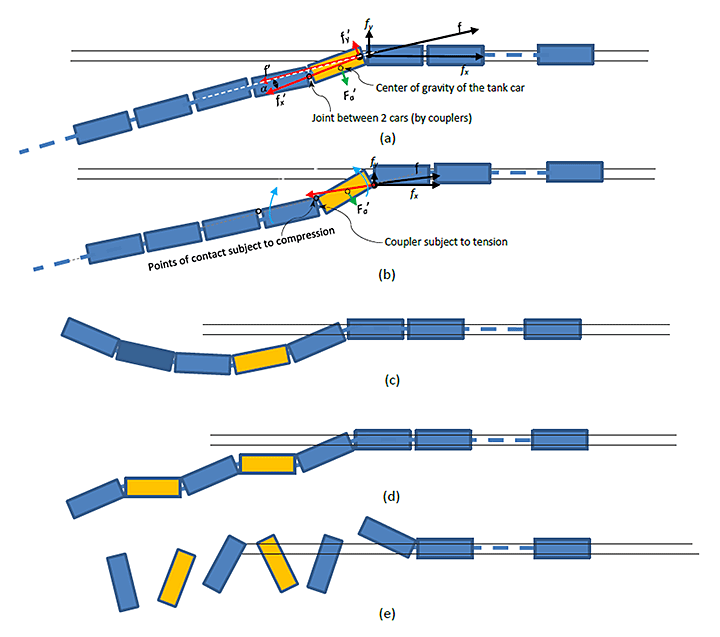 - The final stage starts when a car derails, rotates to an angle with respect to the track and is pushed forward by the remaining train to impact with the derailed cars in front, breaking the coupling between the couplers and causing the next tank car to derail. This process is repeated until the remaining train is stopped by the impeding force.