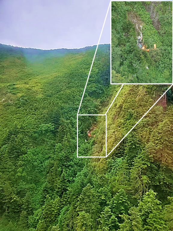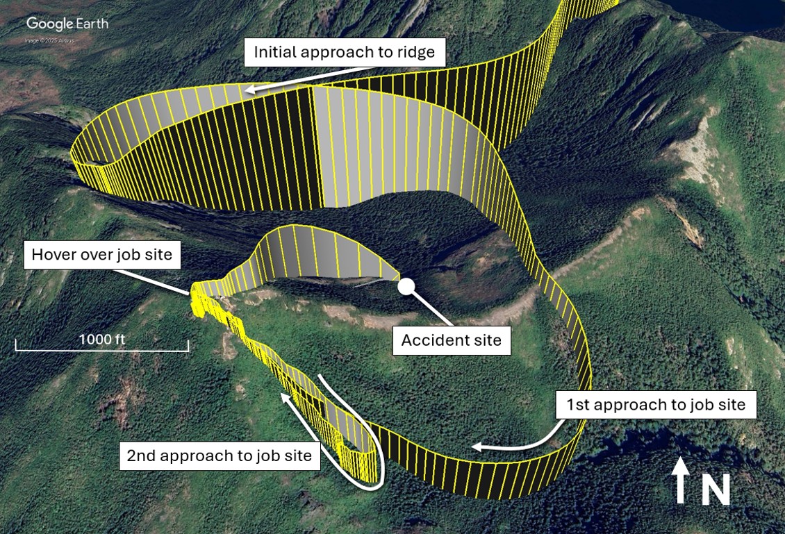 According to the on-board satellite trackingThe helicopter was equipped with a Spidertracks satellite-based aircraft tracking system. The investigation used data from the system to determine the helicopter’s flight profile. equipment, the helicopter proceeded south and approached a ridge approximately 1300 feet north of the job site at 0941; the pilot was likely planning to approach the site from the northwest. The helicopter did not cross the ridge, instead it turned back east from the ridge at 0943, flew south, and approached the job site again, this time from the southeast. At 0944, the helicopter began the approach and arrived over the job site approximately 1 minute later. After hovering for approximately 2 minutes, the helicopter departed at 0947 for unknown reasons and flew approximately 800 feet southeast before returning over the job site at 0949.