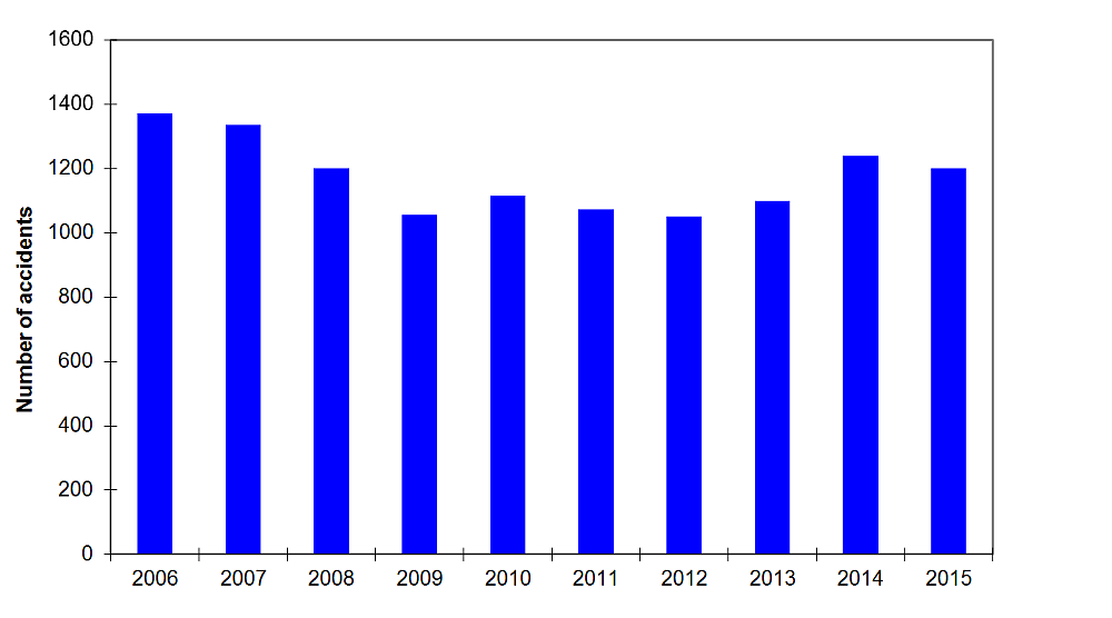 In 2015, 1200 rail accidents Footnote 1 were reported to the TSB (Figure 1), a 3% decrease from the 2014 total of 1238 but an 8% increase from the 2010–­2014 average of 1115.
