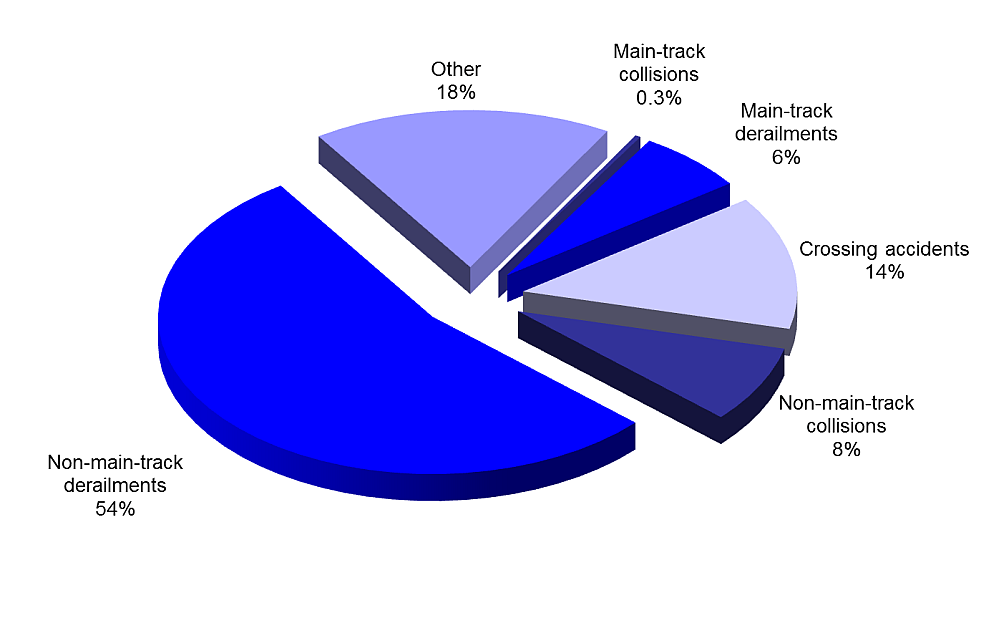 The majority of reported rail accidents (62%) were non-main-track derailments Footnote 2 and collisions (Figure 2). Excluding crossing and trespasser accidents, non-main-track accidents accounted for more than three quarters of the total (77%) in 2015. Most non-main-track accidents are minor, occurring during switching operations at speeds of less than 10 mph.