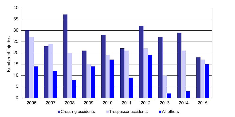In 2015, the proportion of trespasser accidents that were fatal (60%) was down compared with the 5-year average of 65%. The proportion of trespasser accidents resulting in serious injuries (34%) was higher than the 5-year average of 28%.