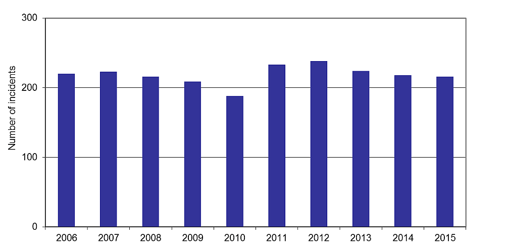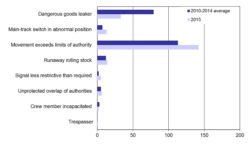 In 2015, there were 216 reported rail incidents (Figure 11), which is comparable to 218 in 2014 and the 5-year average of 220. Incidents of the type “movement exceeds the limit of authority” Footnote 12 (66% of reportable incidents) were the main type of incident, as it has been since 2006, followed by dangerous goods leakers (15%), runaway rolling stock (6%), and main-track switch in abnormal position (6%).