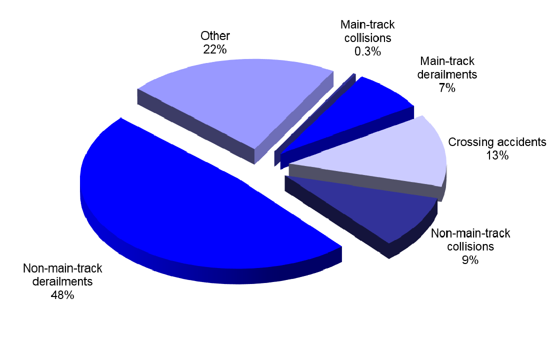 The largest proportion of reported rail accidents comprised non-main-track derailmentsFootnote 2 and collisions (58%) (Figure 2). Typically, most non-main-track accidents are minor, occurring during switching operations at speeds of less than 10 mph. In fact, non-main-track derailments and collisions that do not result in serious injury or damage are now (since 2014) classified as reportable incidents.