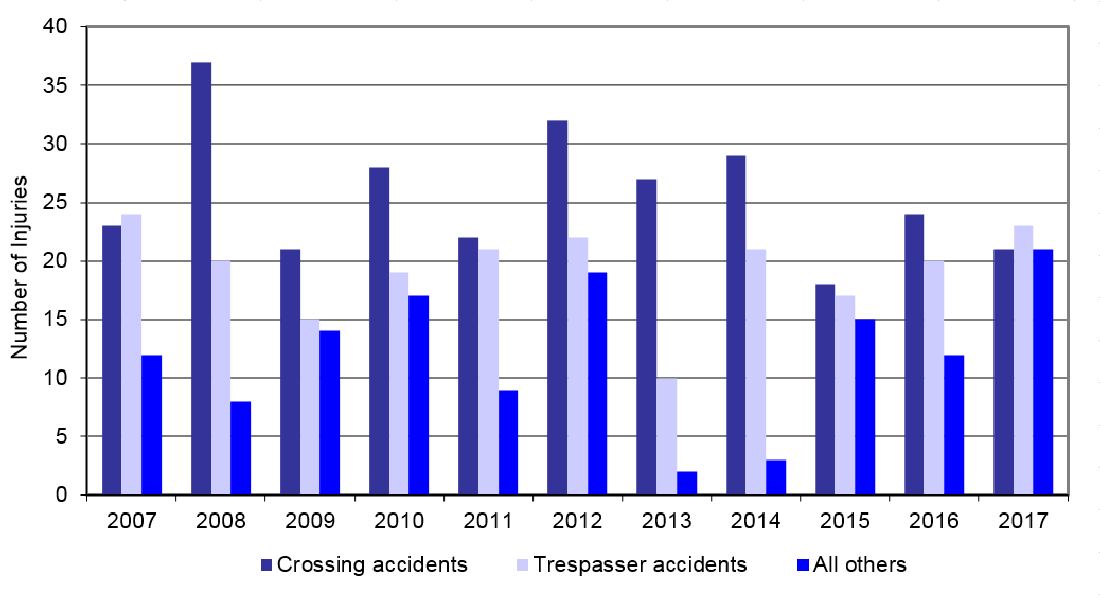 | Year | Crossing accidents | Trespasser accidents | All others |