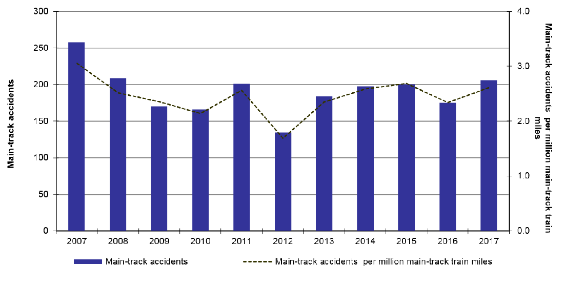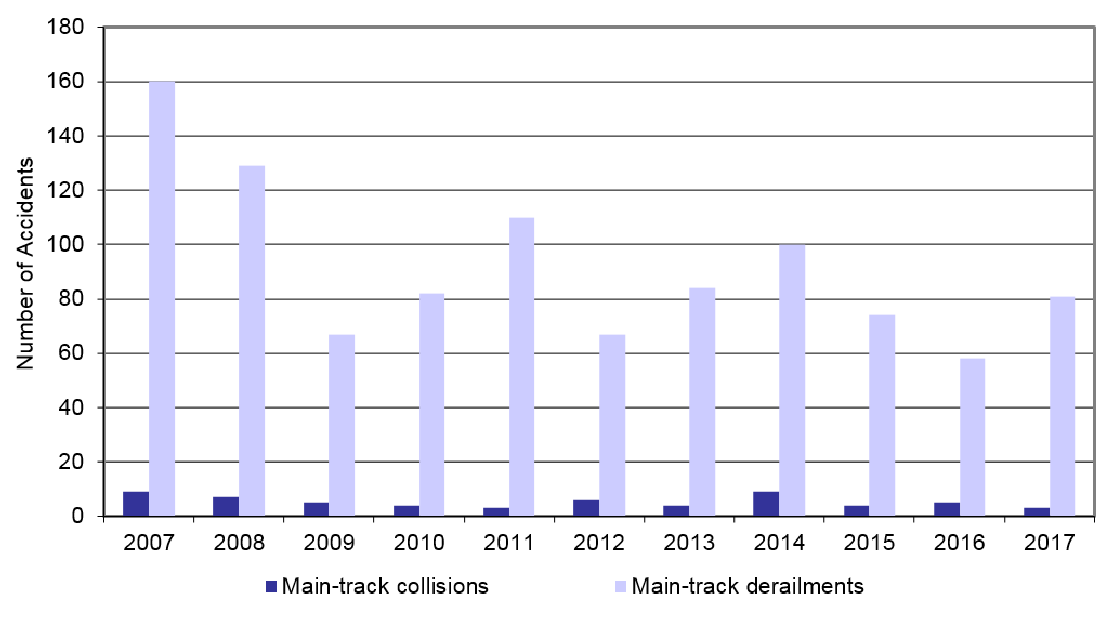 The proportion of accidents that were main-track derailments or collisions in 2017 was approximately the same as both the previous year and the 10-year average.