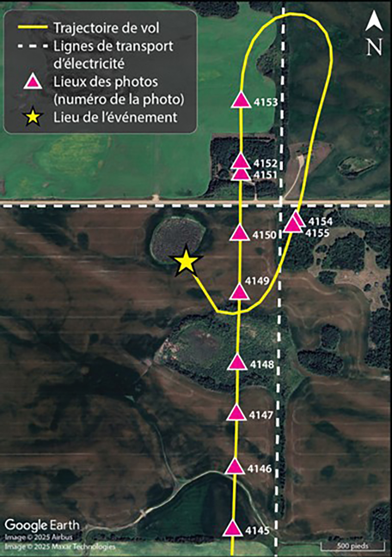 Après un virage d’environ 190°, l’aéronef à l’étude a dévié plus près de la ligne de transport électrique jusqu’à ce que l’observateur prenne les 2 dernières photos. Lorsque les photos furent prises, le pilote a amorcé un 2e virage à droite afin de rejoindre la trajectoire initiale de l’aéronef. Ce virage était plus serré que les virages précédents captés par la caméra vidéo.