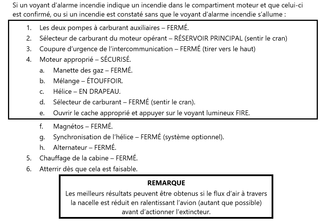 La procédure d’urgence en cas d’incendie moteur (figure 4) contient des éléments à effectuer de mémoire (encadrés) et des éléments à effectuer en suivant la liste (non encadrés)Dans le manuel d’utilisation du pilote du Cessna 421C, les étapes de la procédure d’urgence qui sont entourées d’un trait noir continu (les éléments « encadrés ») représentent des mesures à prendre immédiatement et doivent être mémorisées..