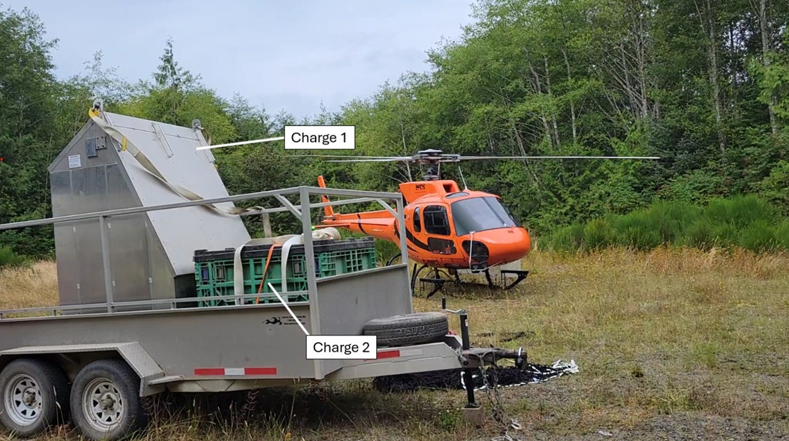 Figure 2. Hélicoptère et équipement à transporter de la zone de rassemblement au chantier (Source : Ressources naturelles Canada, avec annotations du BST)