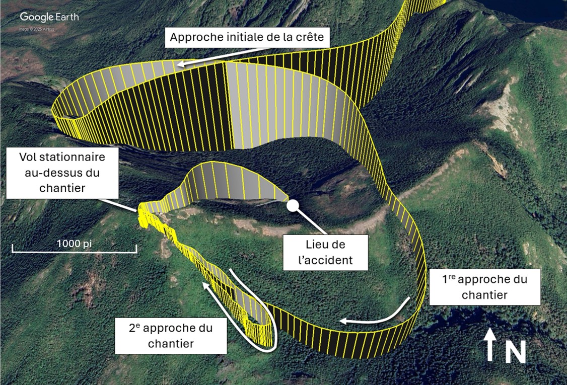 Selon l’équipement de suivi par satellite embarquéL’hélicoptère était équipé d’un système de suivi des vols par satellite Spidertracks. Les données du système ont été utilisées dans le cadre de l’enquête pour déterminer le profil de vol de l’hélicoptère., l’hélicoptère s’est dirigé vers le sud et s’est approché d’une crête située à environ 1300 pieds au nord du chantier à 9 h 41; le pilote prévoyait probablement s’approcher du chantier par le nord-ouest. L’hélicoptère n’a pas franchi la crête, mais a fait demi-tour vers l’est à 9 h 43, a volé vers le sud et s’est approché à nouveau du chantier, cette fois par le sud-est. À 9 h 44, l’hélicoptère a commencé son approche et est arrivé au-dessus du chantier environ 1 minute plus tard. Après un vol stationnaire d’environ 2 minutes, l’hélicoptère a quitté les lieux à 9 h 47 pour des raisons inconnues, et a volé vers le sud-est sur une distance d’environ 800 pieds avant de revenir au-dessus du chantier à 9 h 49.