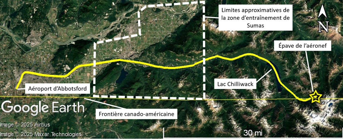 Figure 1. Carte montrant la trajectoire complète du vol à l’étude, les limites approximatives de la zone d’entraînement de Sumas étant indiquées par la ligne pointillée (Source : Google Earth, avec annotations du BST)